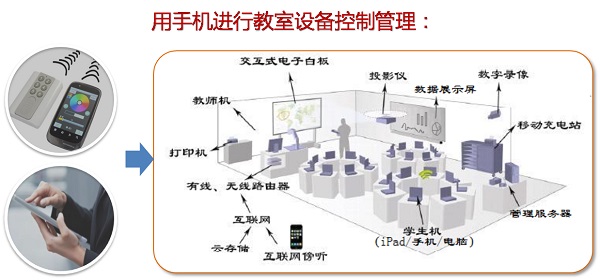 在教室里,教师是课堂的主导,从基础的门窗、灯光、空调等设备到音响、电脑大屏(电子白板),以及多屏互动等,都可以成为课堂教学的辅助工具,而这一切都应该“让老师能以最简便的方式进行操控!”。那么对老师来讲,什么是最方便操控的工具呢?手机。在当今这个移动互联网时代,移动终端—手机无疑是最方便的工具。